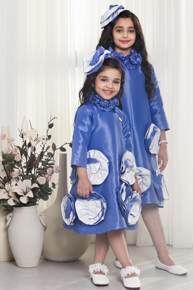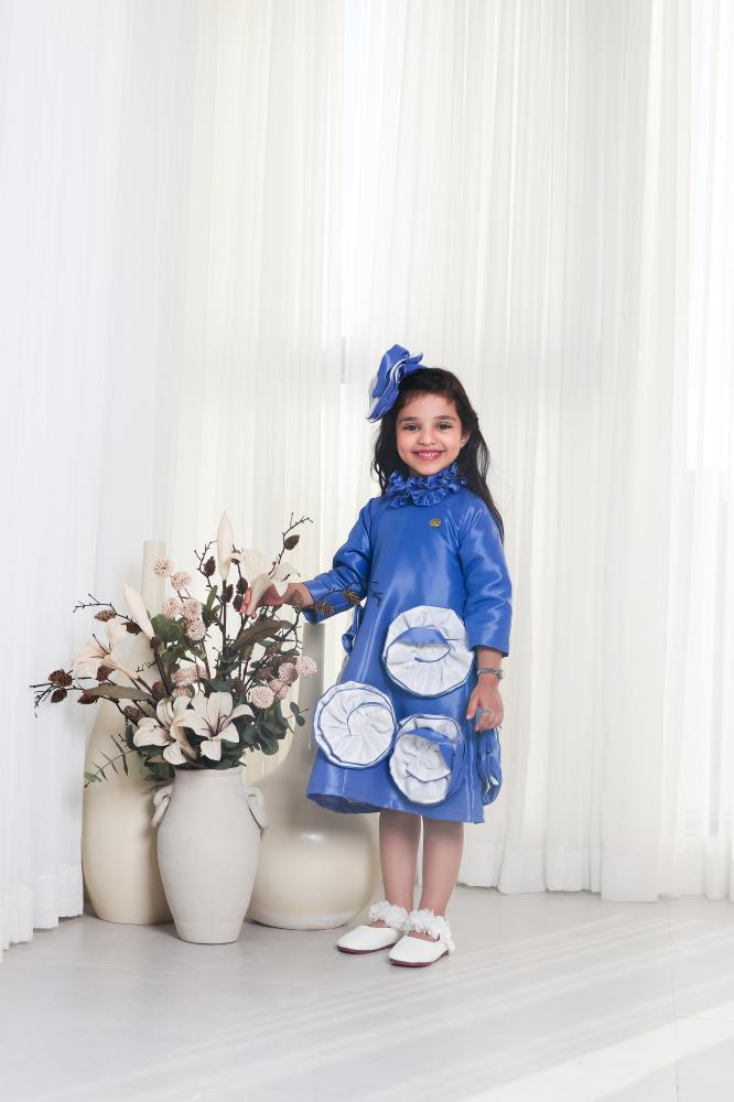 فستان أنيق جدًا بتصميم مبتكر ومميز. القماش من نوع التفته الذي يضفي لمسة فاخرة ورسمية. اللون الأزرق الملكي يزيد من جاذبية الفستان، مع تفاصيل الورود البيضاء الكبيرة المصنوعة من نفس القماش، ما يضيف بعدًا فنيًا وجماليًا للتصميم.