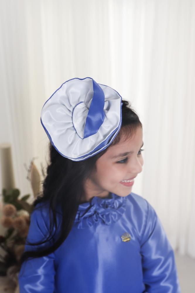 الرقبة المزينة بالكشكش تعطي الفستان طابعًا مميزًا، بالإضافة إلى الأكمام الطويلة التي تمنح إطلالة أنيقة ومحتشمة. القبعة الصغيرة المزينة بنفس ألوان الفستان تكمل المظهر بأسلوب جميل ومتكامل.