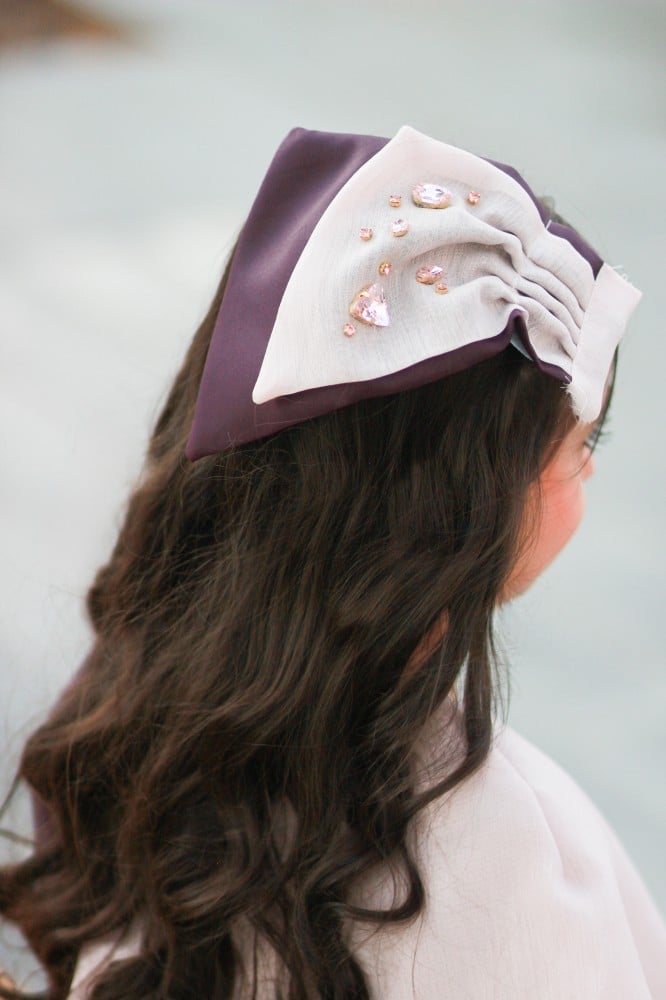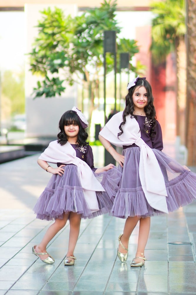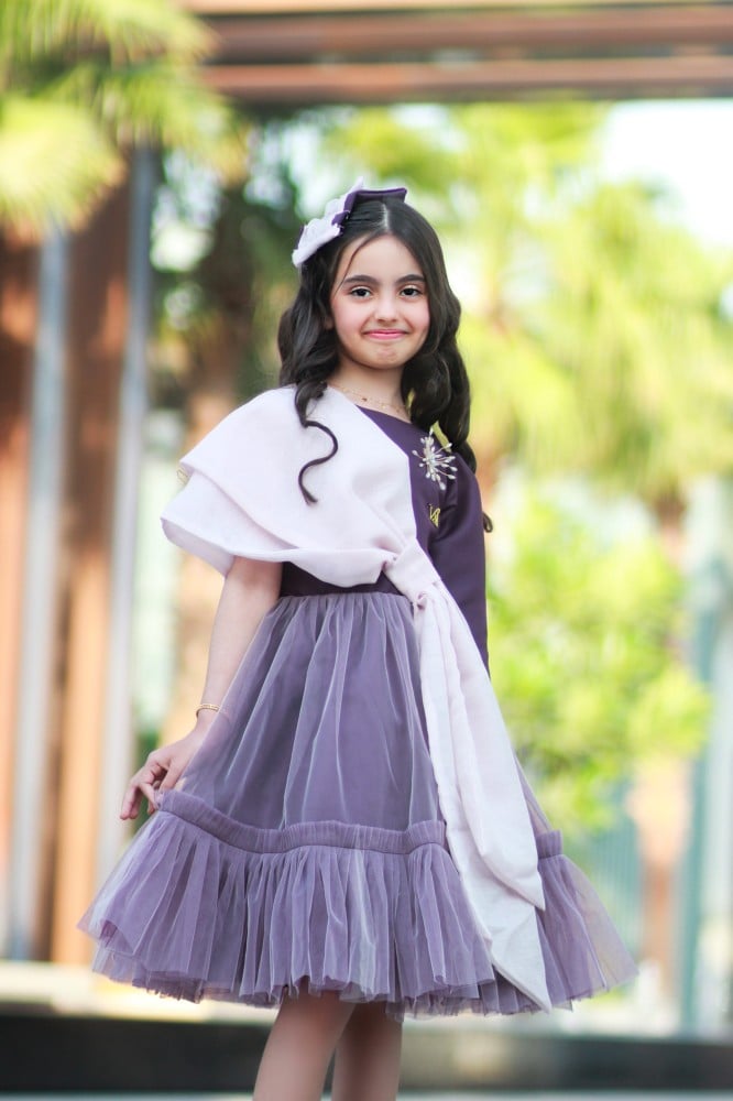 فستان بدرجات اللون البنفسجي يتميز بتصميم فاخر يجمع بين جاذبية الجازار والتفته ورونق التل ،تفاصيل دقيقة وتزيين مميز يضفيان لمسة فريدة على الفستان