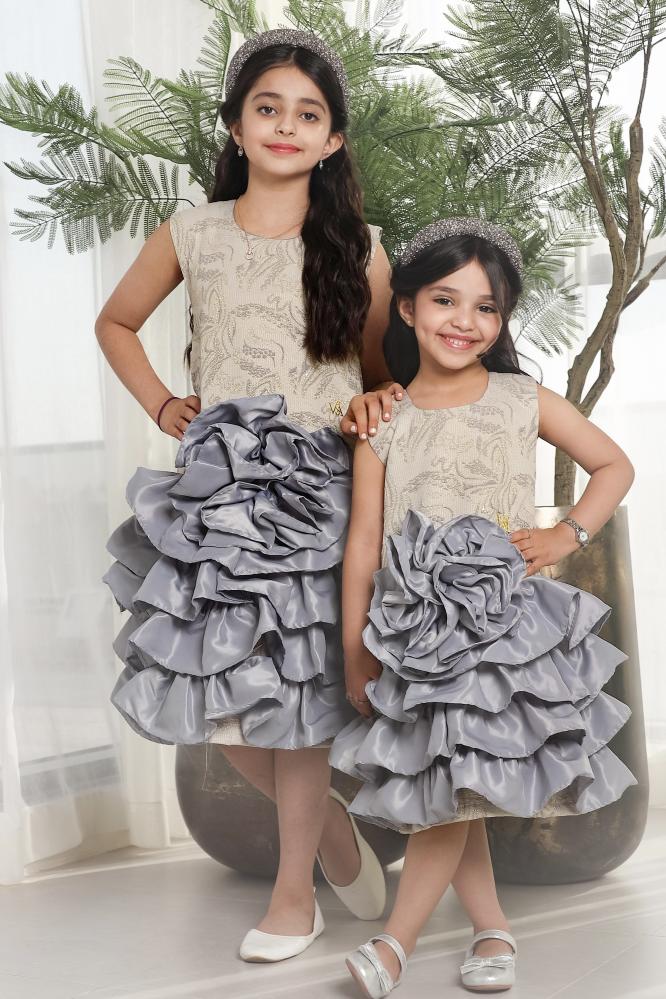 مصنوع من قماش الجاكار المزخرف بتصاميم أنيقة وراقية، مما يمنح الفستان مظهراً كلاسيكياً فخماً و مصنوع من قماش التفته السادة بلون فضي لامع، مصمم بشكل طبقات متدرجة تضفي مظهراً منفوشاً وفريداً مع تفاصيل بارزة تشبه الورود.