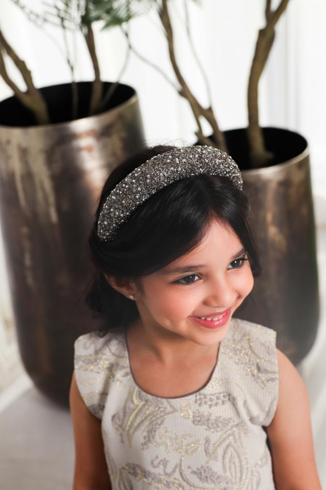 • تم استكمال الإطلالة بإكسسوار للشعر لامع يتناغم مع ألوان الفستان، ما يجعلها مثالية للمناسبات الرسمية والحفلات.
