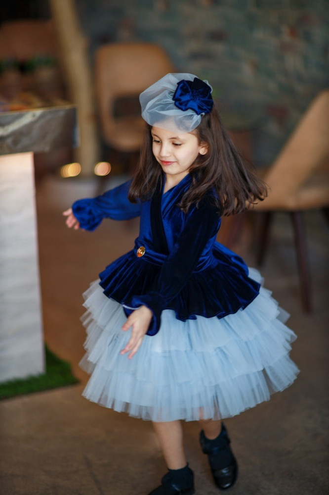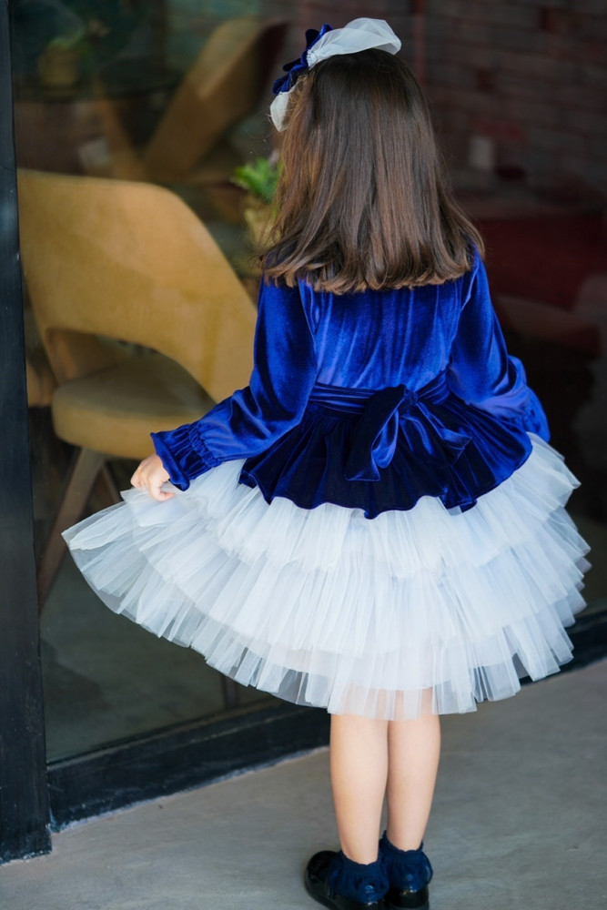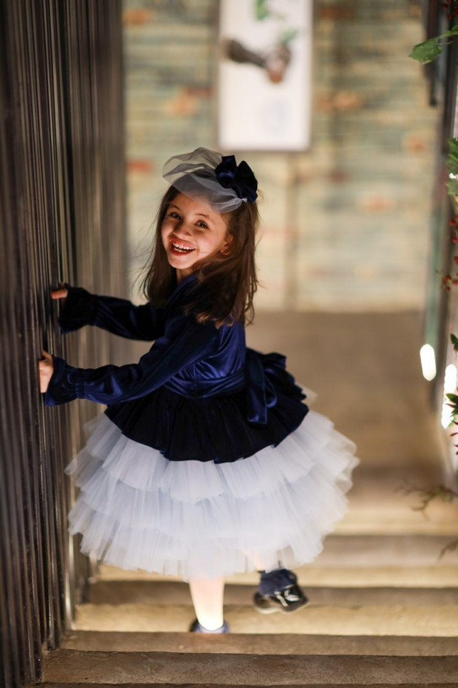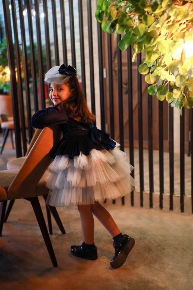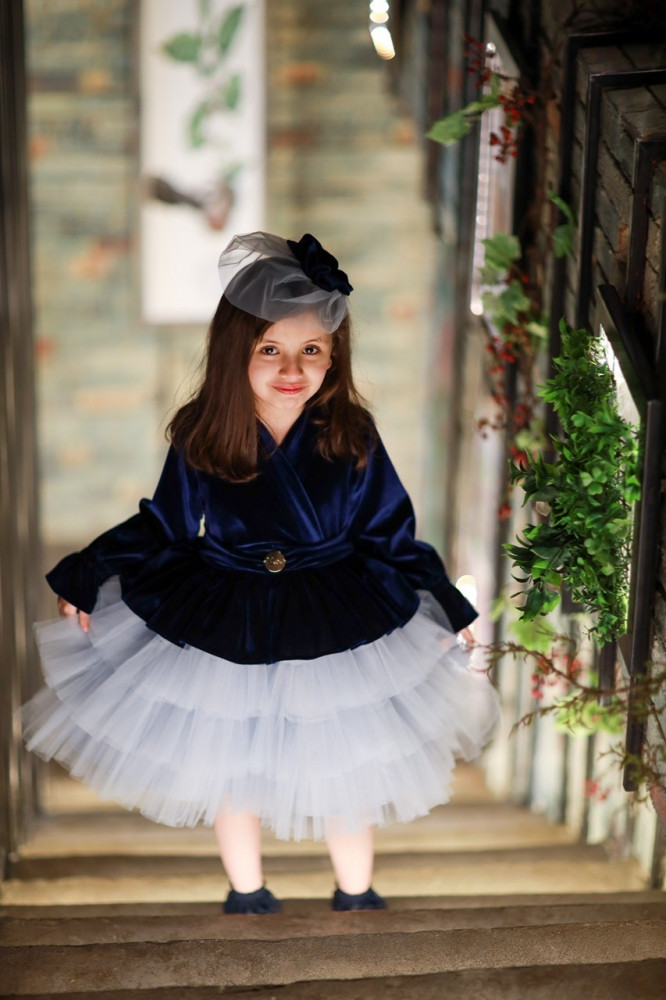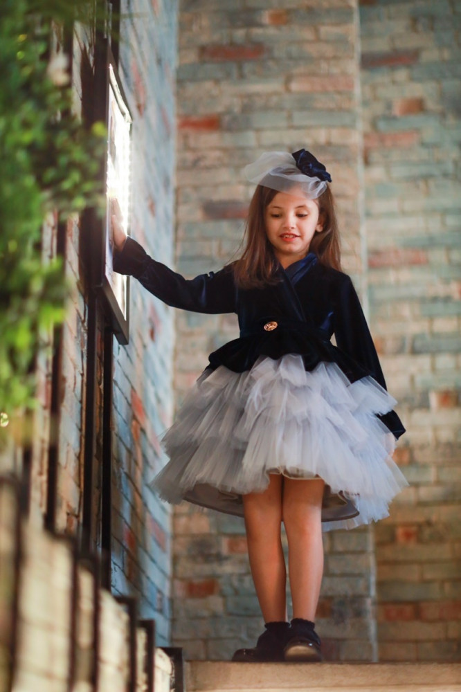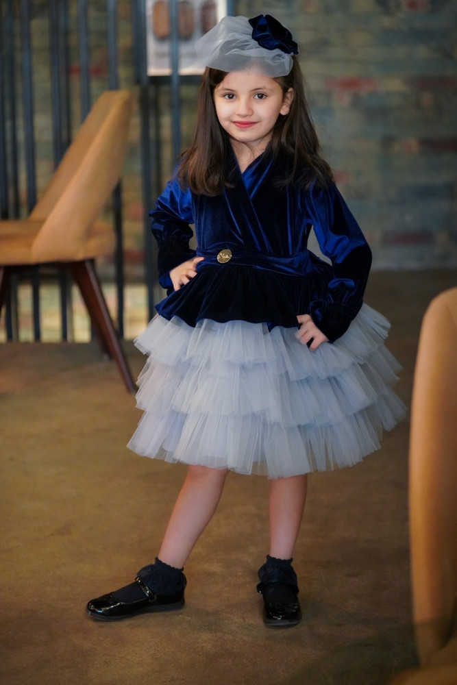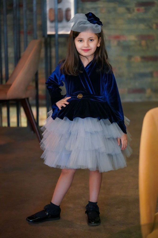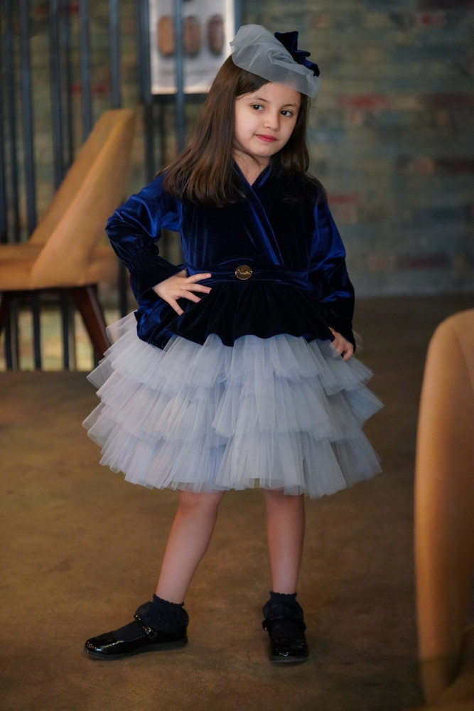 فستان مخمل كحلي مع طبقات التل الرمادي